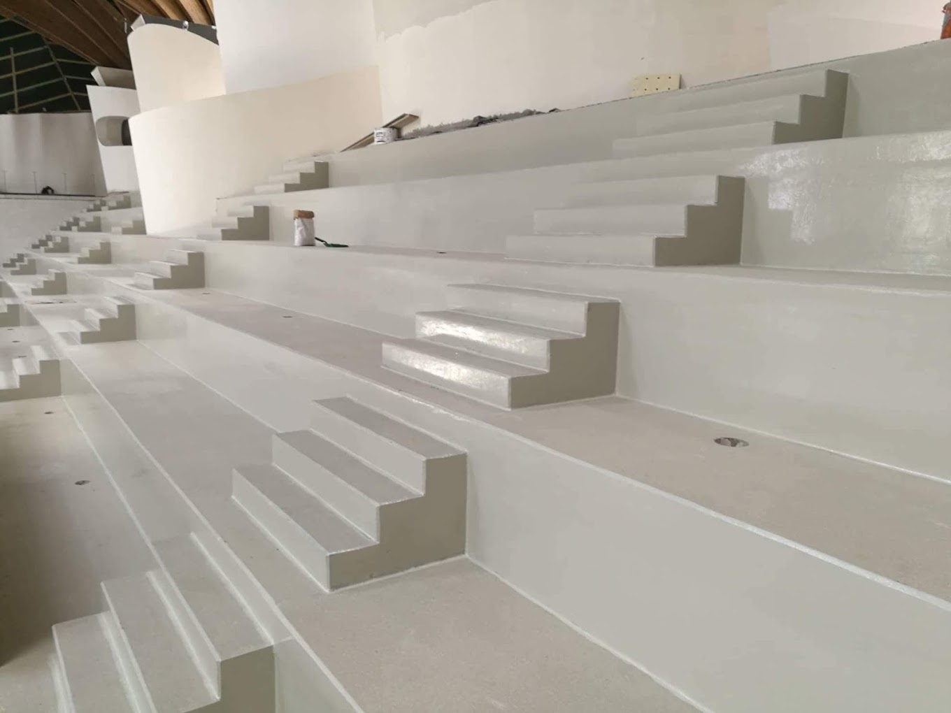 Kopásálló, csúszásmentes műgyanta bevonat a sportcsarnok lelátóin. A burkolat ellenáll a nagy gyalogosforgalomnak, könnyen tisztítható, és biztonságos közlekedést biztosít a nézőknek még nedves cipővel is.